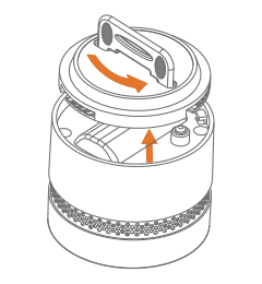 1) Entfernen Sie die Montageplatte des Rauchmelders, indem Sie ihn gegen den Uhrzeigersinn drehen und abheben.