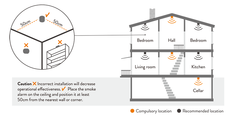 Près d'un mur ou d'un coin: Placez le détecteur de fumée à une distance d'au moins 50 cm d'un mur ou d'un coin.